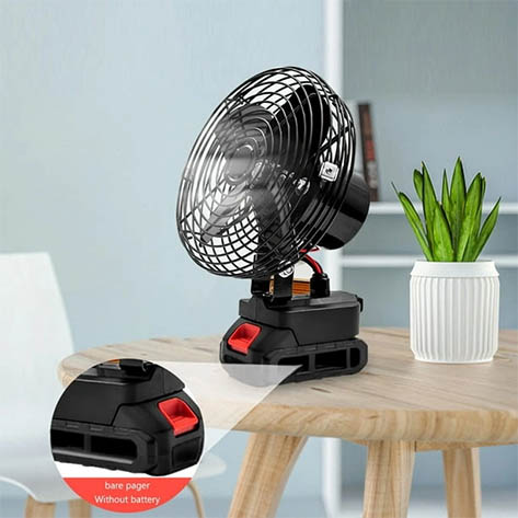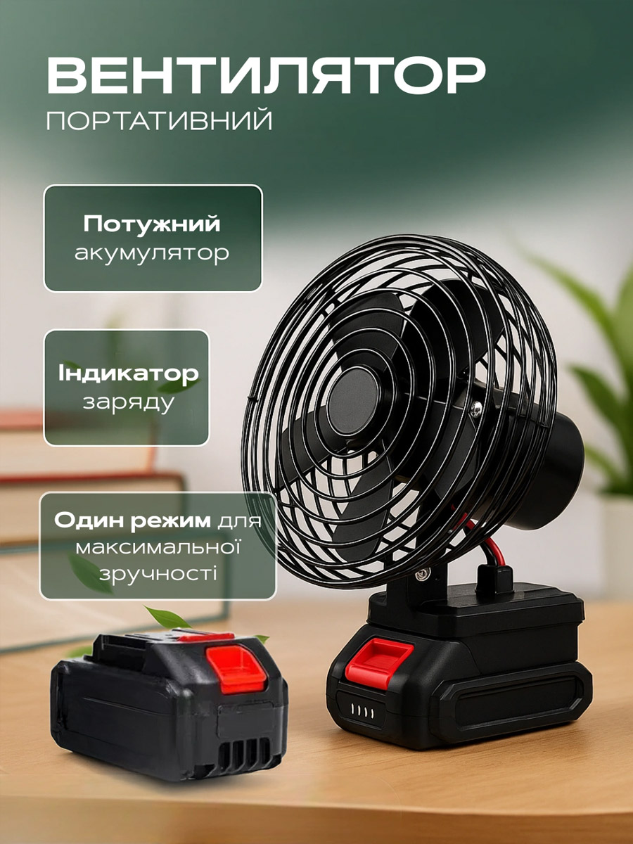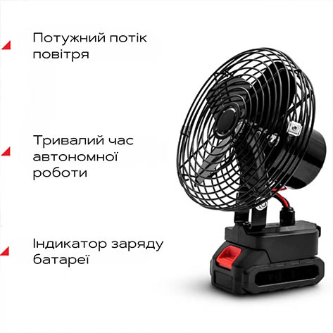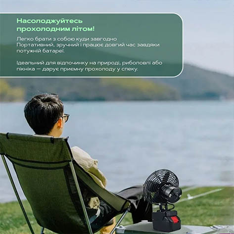 Цей вентилятор працює без розетки, забезпечуючи комфорт в будь-яких умовах завдяки акумулятору 21V.