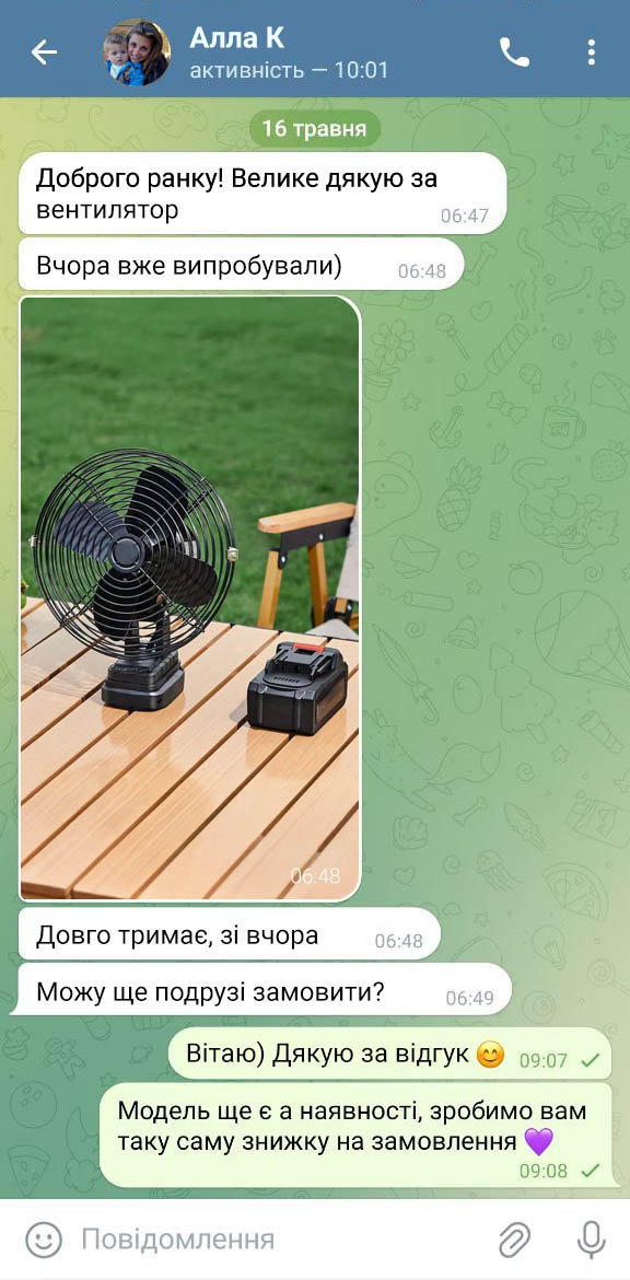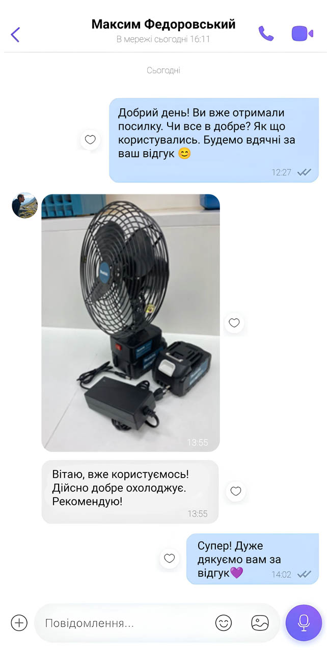 Завдяки двом акумуляторам, вентилятор працює довго і не потребує постійного підключення до мережі.